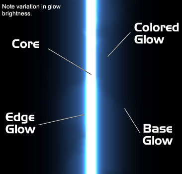 The innermost part of this glow, which I call the edge glow, is very bright and vary narrow. It runs around the outside of the core and is just slightly darker than the core. The edge glow usually flickers, making the blade appear to change shape slightly. Around this is a vividly colored region I simply call the colored glow. This is where most of the blade's color is and it is simply a translucent patch of color that fades outward. (The colored glow often pulsates, too, especially when the blade isn't moving much). The largest and dimmest area is the base glow, which has little color and is nearly unnoticeable in still pictures.