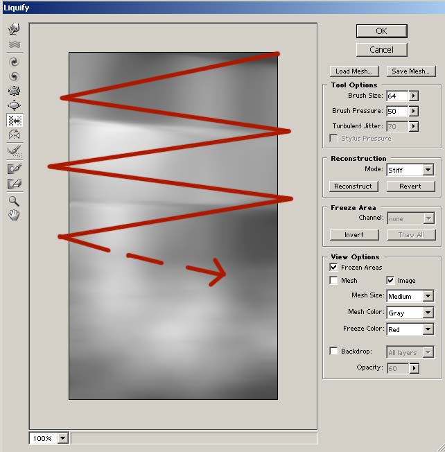 Step 3. Next, go to filter/liquify. Select the "shift pixels tool" from the left hand toolbar and keep the default settings. Brush size: 64 and brush pressure: 50. Now, using quick and sweeping strokes, begin at the top of your image and sweep back and forth across your image with slightly overlapping strokes. This should take about 8-10 overlapping strokes. If you mess up, don't panic! Simply click the "revert" button on the right side of the window.